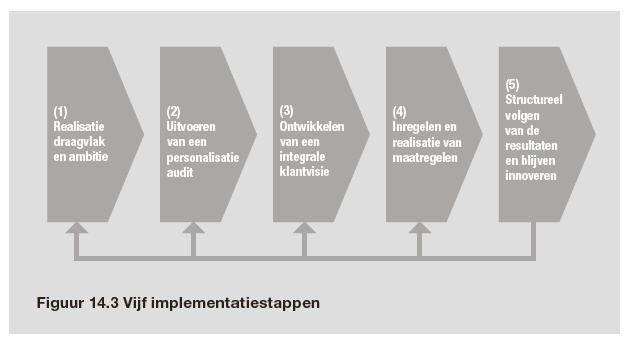 Er zijn mensen die na de aanschaf van een IKEA-kast eerst de montagehandleiding uitvoerig bestuderen en de uitdaging willen begrijpen alvorens ze aan de slag gaan. Dit zullen de grotere organisaties zijn die AI-personalisatie als een van de strategische speerpunten voor de hele organisatie zien. Ze zien de voordelen, maar zeker ook de enorme consequenties voor bijvoorbeeld de cultuur, de digitalisering, de processen, de besturing en de impact op klantonderzoek. In feite benaderen ze top-down dit vraagstuk waarbij ze de vijf dimensies betrekken. Onderstaand figuur geeft een aanpak in vijf stappen.