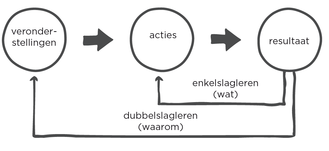 Nieuwe kennis creƫren kun je op twee niveaus doen, volgens Chris Argyris en Donald Schƶn . Je kunt enkelslagsleren en dubbelslagsleren. Ik leg het uit. De ervaringen die jij hebt, zijn het gevolg van allerlei acties die je doet. Die acties zijn weer gebaseerd op allerlei veronderstellingen en inzichten die je hebt. Wanneer je niet het resultaat krijgt dat je voor ogen had, kun je je acties aanpassen zonder de achterliggende veronderstellingen en inzichten aan te pakken. Dit kun je net zo lang doen tot je het gewenste resultaat krijgt. Dit is enkelslagsleren en dit werkt vaak prima. Maar wat als jouw acties gebaseerd zijn op foute of achterhaalde veronderstellingen of inzichten? Wanneer je aan de slag gaat met het onderzoeken en veranderen van je veronderstellingen en inzichten, dan ben je bezig met dubbelslagsleren. Je gaat daarmee een niveau dieper. Je zet dan niet alleen vraagtekens bij wat je doet, maar ook bij waarom je het doet. En dat is belangrijk, want sommige oplossingen voor problemen kun je alleen bedenken wanneer je aan de slag gaat met je veronderstellingen en inzichten. Zodat je vervolgens nieuwe acties kunt bedenken die hierbij aansluiten.
