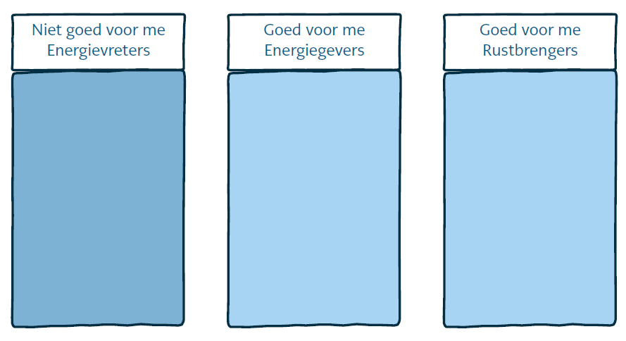 2 In de middelste kolom schrijf je alle dingen die je energie geven: je energiegevers. Wat geeft je energie? Waar word jij vrolijk van? Waar laad jij jezelf mee op?